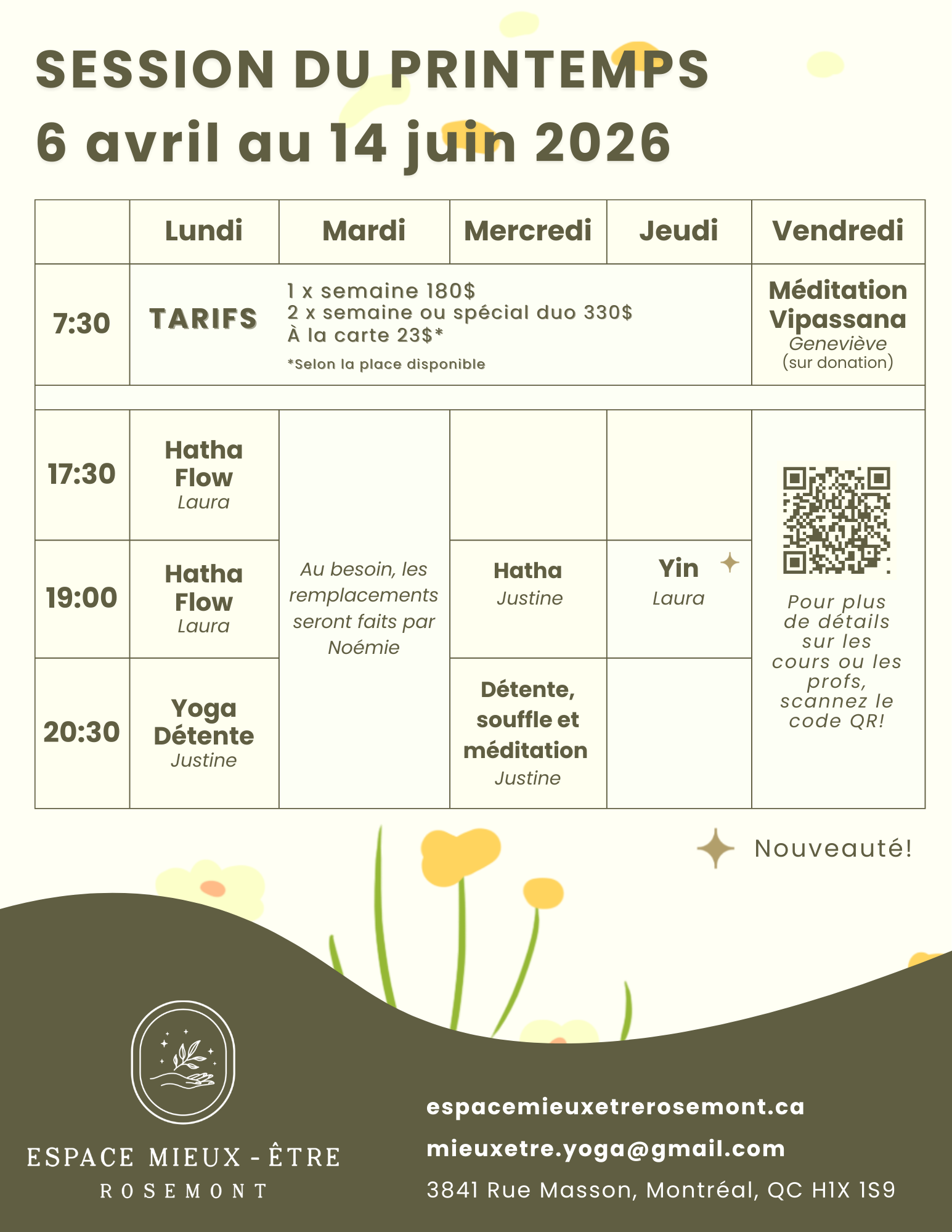Ce cours est une invitation à revenir à soi, à écouter chaque souffle et à se permettre de lâcher prise. Il s’adresse à toutes celles et ceux qui souhaitent se reconnecter profondément à leur corps, apaiser leur esprit et faire naître un bien-être doux et profond. En équilibrant le système nerveux et en apaisant l'agitation du quotidien, nous créerons un espace propice à une transition sereine vers la nuit. À travers des respirations conscientes, des postures douces soutenues par des accessoires, et des méditations guidées, chaque participant(e) sera invité(e) à plonger dans un moment de présence à soi.